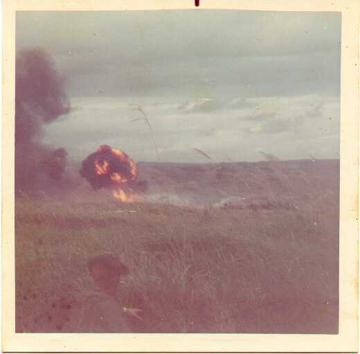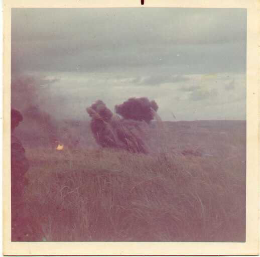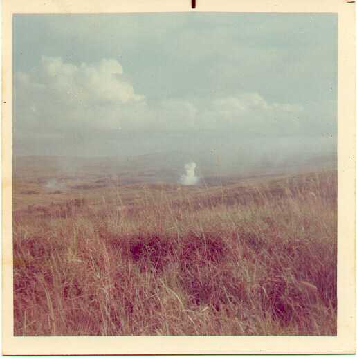 Playing peek-a-boooom! We had recently moved out of the treeline to observe the hills.The enemy had followed, they would attempt to break out of the treeline and were pushed back with small arms fire. No sooner did they enter back into the treeline when a package of artillery would be delivered. |