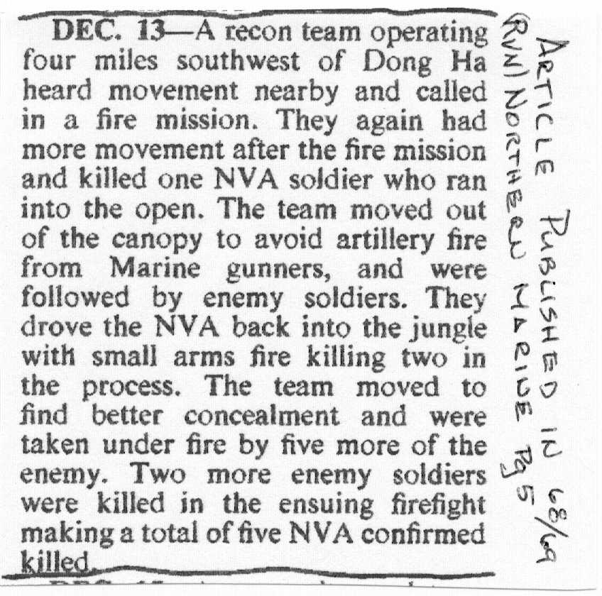 Article on the patrol that appeared on page 5 of Northern Marine Magazine (RVN) 68/69. Patrol (Team) Leader Pfc. Thomas E. Shainline of team 1C3 would be awarded his 1st Silver Star for his heroic actions on this patrol. He would later earn a 2nd Silver Star for his actions on June 1/2 of 1969 on Mutters Ridge (Hill 484). |