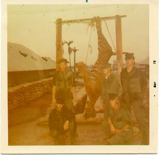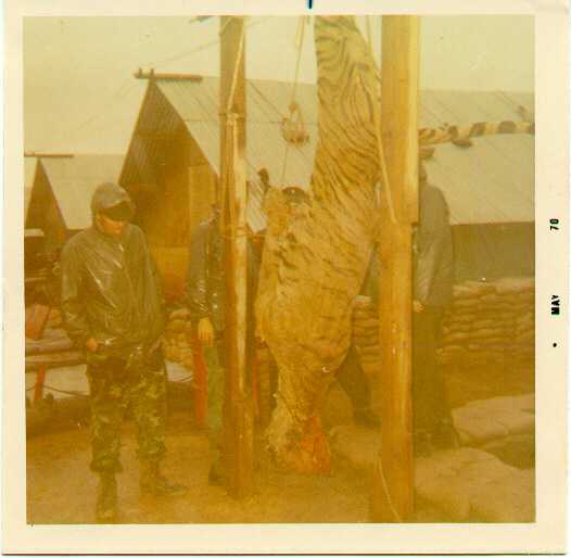Unidentified Reconner's viewing remains of man-eating tiger hanging in Charlie Co. area. The tiger had killed a marine near FSB Alpine on November 12th and attacked Plt. Sgt Richard Goolden on December 22nd. |