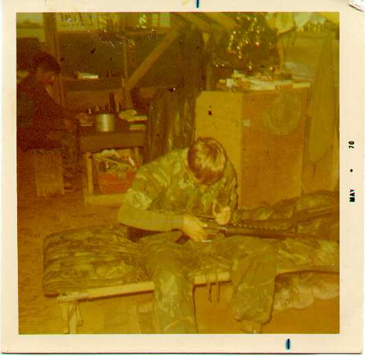 Pfc. Wilson of 1C2 in foreground cleaning his gear, with Pfc. Antony Cardenas in background...I Don't know where he found the Christmas tree. |