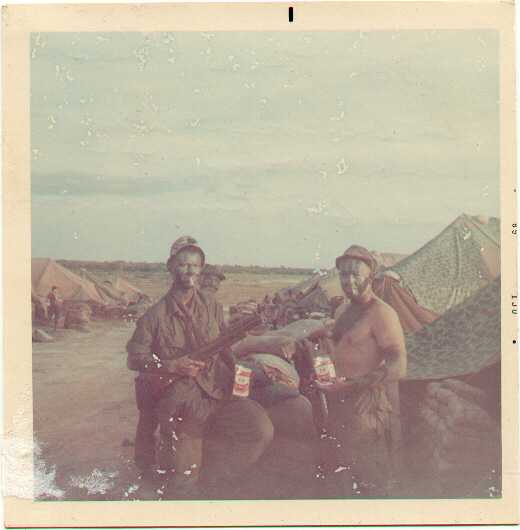 Pfc. Beauclair in background with Pfc. Dennis M. Soldner in foreground at Quang Tri LZ waiting for insertion birds to take us to Hill 819 being congratulated as a member of Team 1C2 (Cpl. Pete) For participating in mission that took place on the Razorback Ridge in August. |