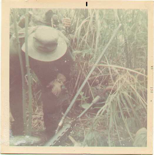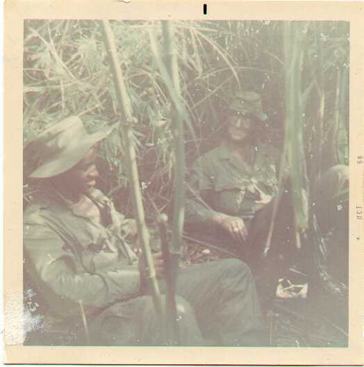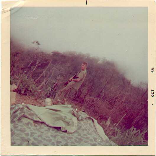 L/Cpl. Jackie Lee Blankenship (Buck) in background & L/Cpl. Robert P. Jones in foreground taking a break on Hill 679. Later that day as contact was made with NVA and Jones was seriously wounded as the team was being extracted. |