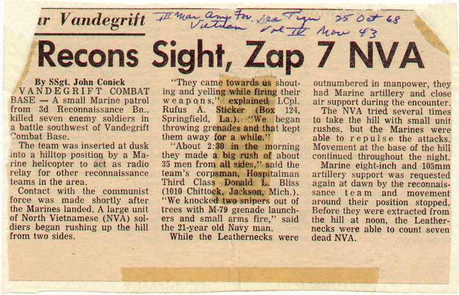 Article published in III Marine Amphibious Force Vietnam, Sea Tiger Vol. IV, No. 43 dated 25 Oct 68, regarding Hill 824 patrol by team 1C3.