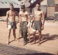 The Walking Wounded. (Left to Right) Sgt.Thomas L. Henning, Cpl. Thomas E Shainline, and Pfc.Robert Owen, members of Team 1C3 / Old Colonel return to "C" Company after our "Stingray" mission atop Hill 484 on Mutters Ridge. Photo Courtesy of Thomas E. Shainline. |