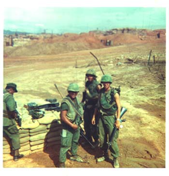Left to right: PFC M.D. Diaz, L/Cpl Vidal Maldonado, PFC Charles Kimble, and L/Cpl Stephen D. Buck June 1968. (Photo from S. Buck)
