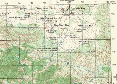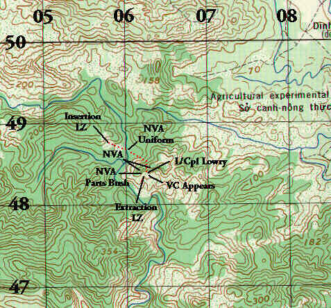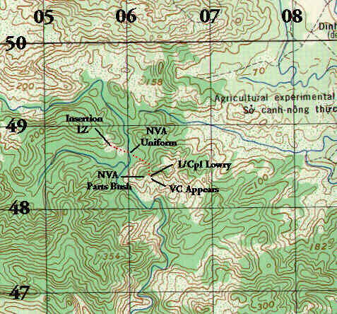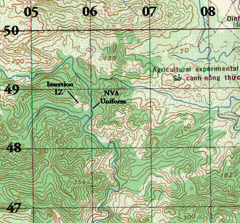 It was Monday, November 25th, 1968, three (3) days before Thanksgiving. The team was inserted on a finger below a ridgeline to our south. The finger then dropped off into a heavy dense forest that ran north and northeast. There was a valley to the east, a field with low grass running east. It was U-shaped and was bordered by the finger in the west, the base of the hills to the south, and in the northeast where the dense forest headed. In the jungle forest was a "suspected" enemy camp. It was believed to contain a possible POW interim camp and used as a base to infiltrate into the village of Thon Doc Kinh (Tin City) at coordinates YD096524. The area was located at coordinates YD062484, just south of Hill 158 and a ridgeline on the southern edge, which includes Hill 354. This was on the western end of an area often referred to as the "Backyard", ours maybe, but it should have been called the "Front Porch", theirs.