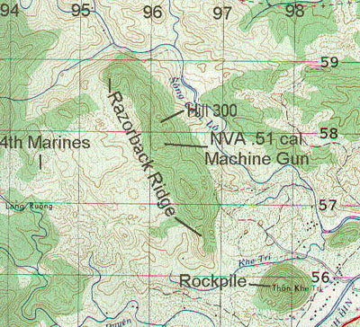 As we approached the Razorback we were all on our feet looking out our portholes, I was in awe of what I saw. L/Cpl. Jones was with the crew chief and was communicating to the pilot. We swung north of the Razorback and made a north-south approach towards Hill 300. The ramp was lowered and L/Cpl. Jones and the crew chief were on it holding on. There was no LZ (Landing Zone) per se; the chopper was not going to be able to touch down. The intention was to approach out of the north to the southern edge of Hill 300, hover with the blades just above some small trees, place the ramp just above a large protruding rock formation and then we would jump onto it. Our timing and the skill of the pilot would play a key role in our insertion.