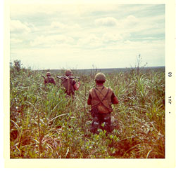 This photo was taken in June 1968 outside of Cam Lo. We were patroling around the base perimeter. From left to right is, PFC Charles Kimble on point, Cpl Paul Welsh with the M-60 and L/Cpl Vidal Maldonado in front of me. Photo by Steve Buck