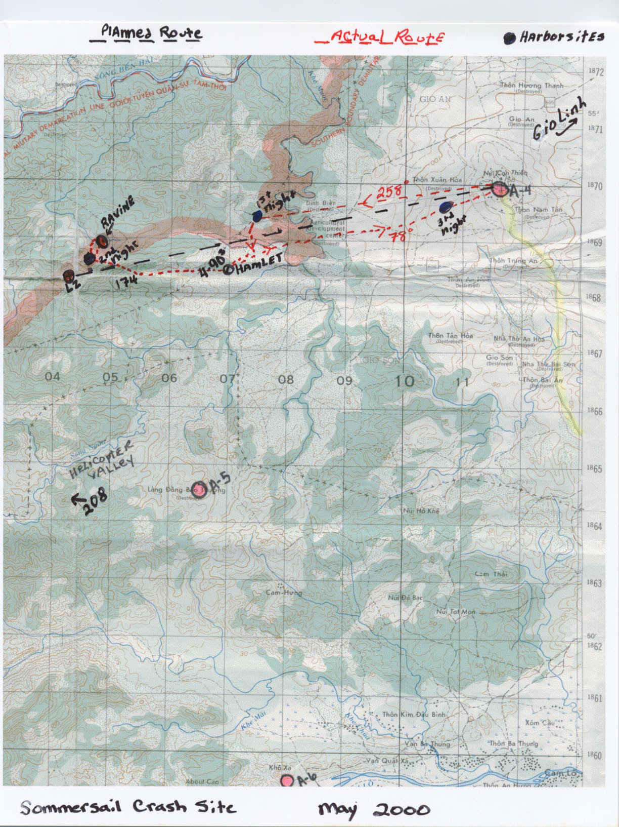 The Somersail crash site lies approximately 4.5 miles from Con Thien on an azimuth of 258 degrees magnetic. I still have the topo maps that we used 33 years ago and they are still extremely accurate. The villages are not the same but the topo is and that is what is important. Most hamlets now have communist names. Example, Khe Sanh is best referred to by the pre-American name, Huong Hoa. The prominent hill in the crash area is Hill 174. The site is about 3.5-4 km north of Helicopter Valley (Song Ngan Valley). At times while hiking toward the site, hill 174 is visible and the compass is not needed.
